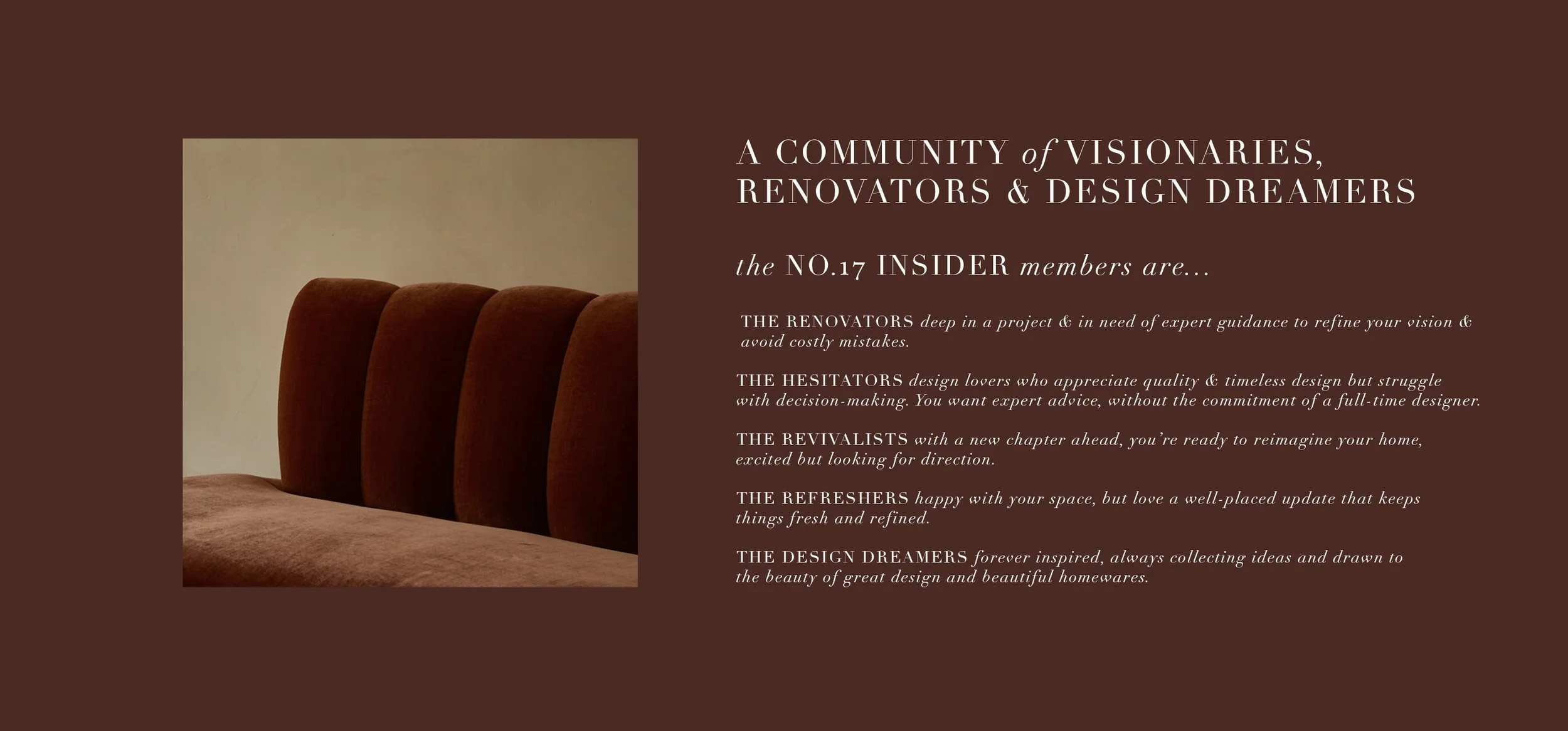 A home for visionaries, renovators and design dreamers, The No.17 Insider is an exclusive online membership platform and doorway into the world of elevated home design. Redesigning and renovating our homes in a timeless, innovative and thoughtful way is a full-time pursuit. It requires extensive research, experience, sourcing, decision-making, craftsmanship and creative sensitivity.