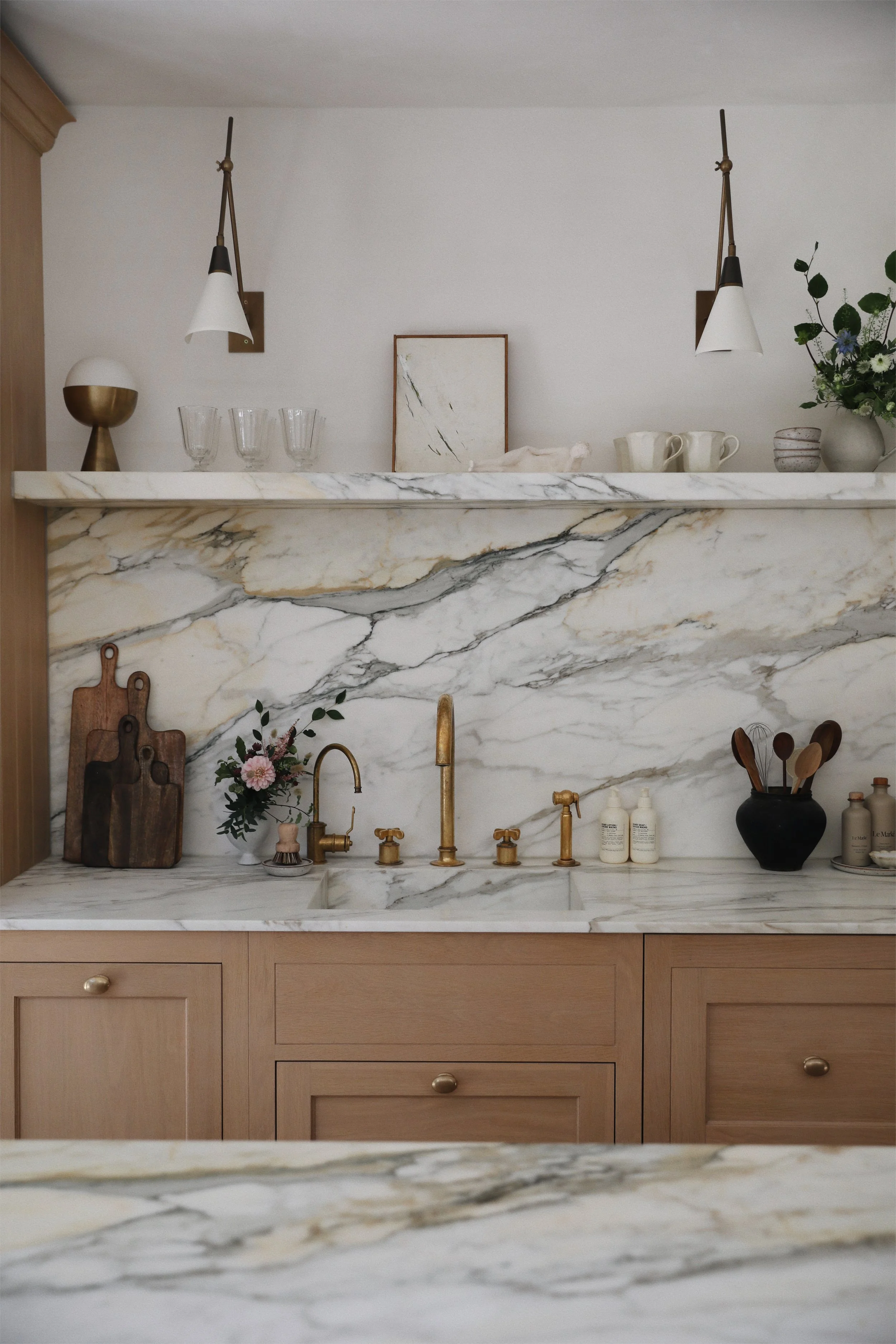 Your kitchen is the beating heart of your home, a central hub to cook, entertain, converse, laugh, dance, drink tea, reflect and everything in between. So when it comes to designing a space you will spend so much time enjoying over the years, every detail should be considered. Functionality should blend seamlessly with beauty, allowing your personality to shine. When designing our kitchen, we drew inspiration from the serene elegance of California homes — light, airy and effortlessly sophisticated. Our brief was to bring this vision to life using beautiful natural materials, stone, oak and brass, each element chosen to create a space that is both timeless and inviting. The only remaining question was, how do we make it an impact. How do we make the space sing? The answer lay in a standout feature: our floating marble shelf. Not just a functional cornerstone of the kitchen, it also serves as a canvas for showcasing decorative and beautiful objects, adding our personality and turning the space into a stage where form and function gracefully coexist.