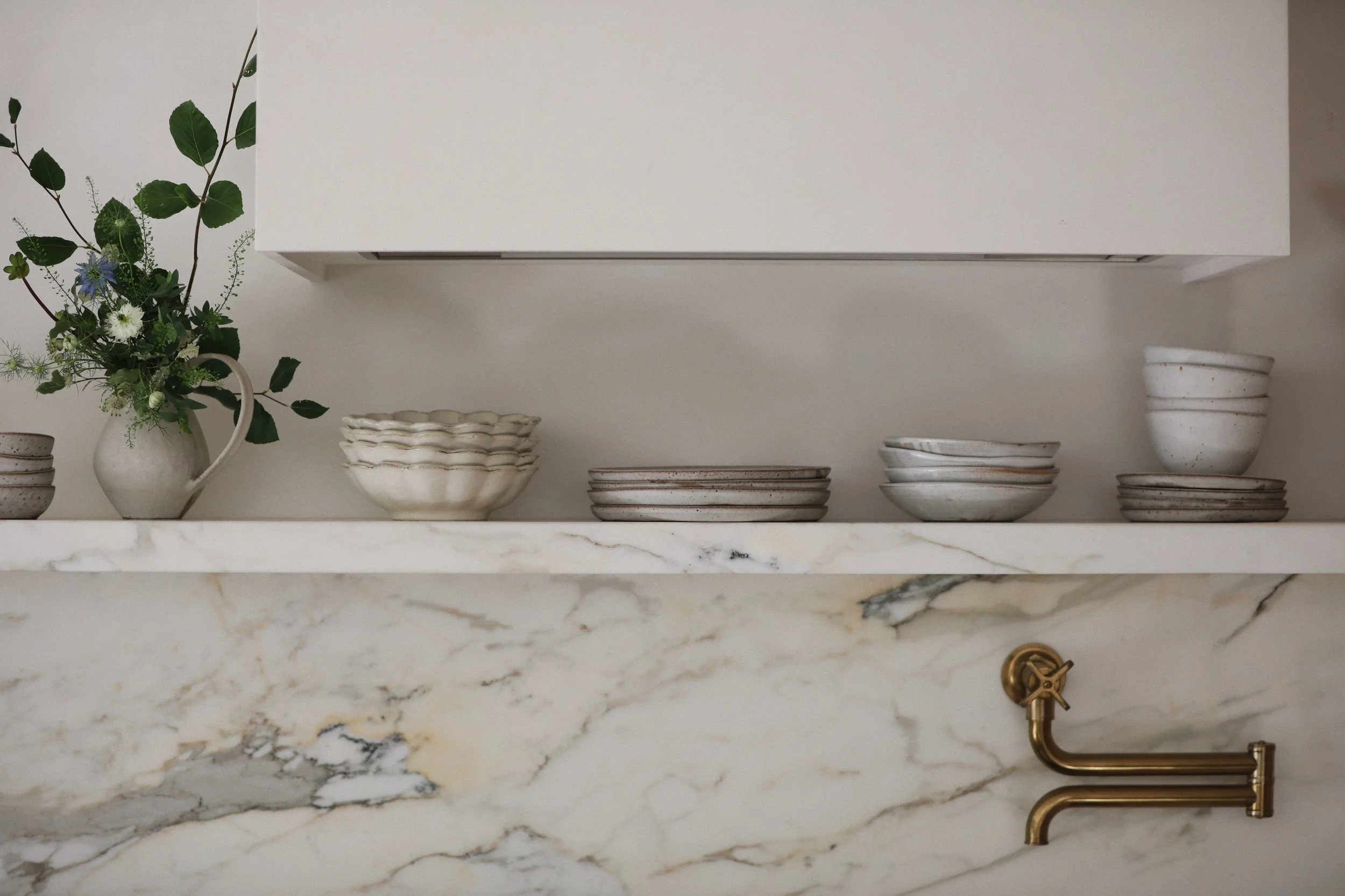 Marble has long been synonymous with luxury, timelessness and an undeniable touch of elegance. When we decided to incorporate a floating marble shelf into our kitchen, we chose marble not just for its beauty but for its ability to blend solidity with an ethereal quality. The result is a shelf that seems to defy gravity, appearing both substantial and weightless. While traditional shelving often fades into the background, this piece commands attention. It’s an artwork in its own right, a testament to thoughtful design and a functional sculpture that adds depth and character to our kitchen, whilst serving as a perfect display space for our curated collection of artisanal ceramics, glassware and culinary treasures.