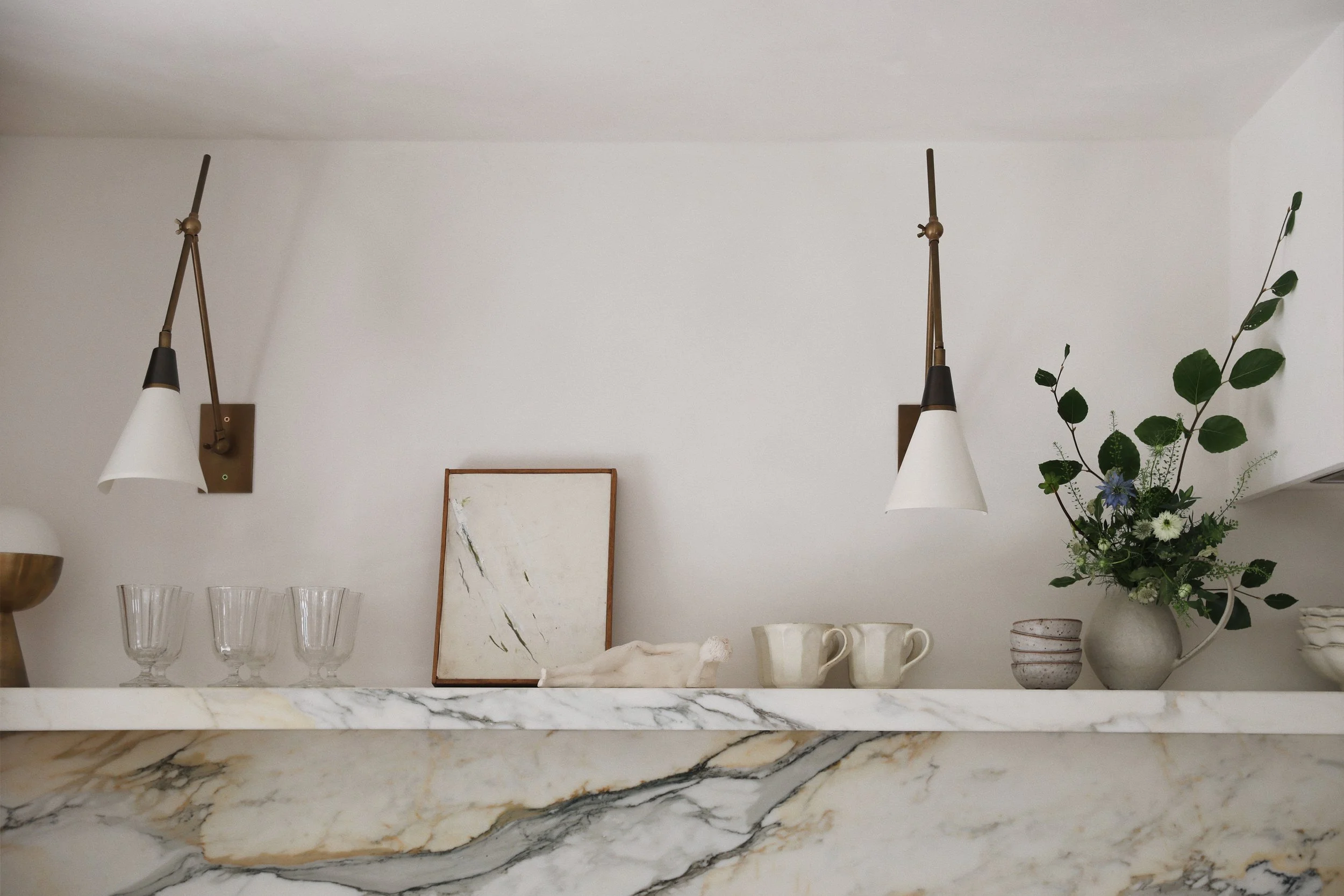 With your floating marble shelf installed, it's time to showcase your creativity and adorn it with decorative accents that reflect your personal style and taste. Try to maintain that minimal sensibility, an open shelf can quickly appear cluttered and noisy, so remember less is more. Whether showcasing sculptural elements, displaying beautiful artwork, or arranging a curated collection of plates and jugs, the possibilities are endless and can always be reimagined once the foundation is there. Remember, experimentation is key, let your curiosity guide you and above all, enjoy the process. Your floating marble shelf is not just a striking feature or a functional element — it’s a canvas for your expression and creativity in the heart of your home.